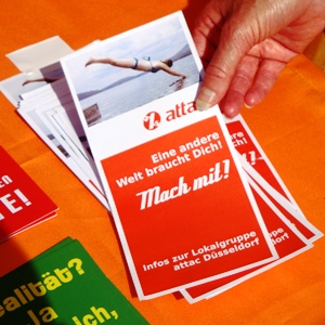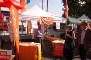 Der Attac Infostand beim zakk Straßenfest (3. September 2017) – endlich mal hatte das Straßenfest Glück mit dem Wetter!