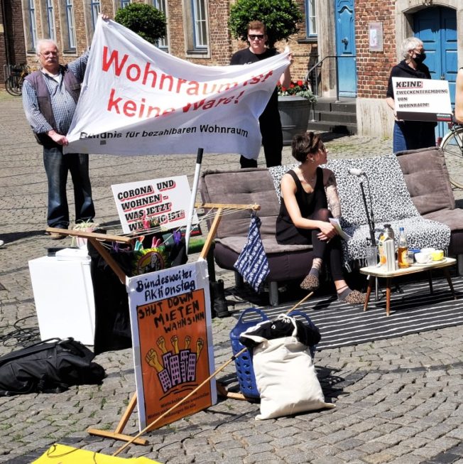 „Bündnis für bezahlbaren Wohnraum“ protestiert im Freiluft-Wohnzimmer gegen die Belastungen für Mieter*innen in der Corona-Krise Aktion am 20.6.2020 auf dem Rathausmarkt. Was jetzt in der Corona-Krise zum Thema Wohnen wirklich wichtig ist, darauf macht das „Bündnis für bezahlbaren Wohnraum“ mit einer Plakataktion, einem Freiluft-Wohnzimmer und einem wohnungspolitischen Sofa-Talk aufmerksam. Die Aktion ist Teil des bundesweiten…