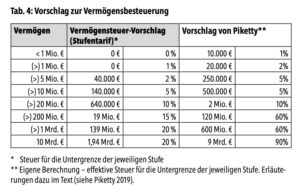 Der Vorschlag von Attac sieht vor, dass das gesamte Vermögen einschließlich des Auslandsvermögens auf der Basis des um 30% reduzierten aktuellen Marktwertes versteuert wird. Der Freibetrag soll eine Million Euro pro Person betragen. Eine Altersversorgung ohne Kapitalwahlrecht bei der Auszahlung wird nicht angerechnet. Attac schlägt einen Stufentarif vor, der mit einem Steuersatz von 1% beginnt. Bei 20 Millionen Euro erreicht die Steuer 10%. Danach steigt sie weiter progressiv an bis zum Spitzensteuersatz von 20% für Milliardär:innen. Dabei muss man bei der Abschätzung der Umverteilungswirkung berücksichtigen, dass das Vermögen von Milliardär:innen vor Steuern im Durchschnitt um mehr als 10% wächst. Inlandsvermögen von Ausländer:innen werden ebenfalls besteuert.